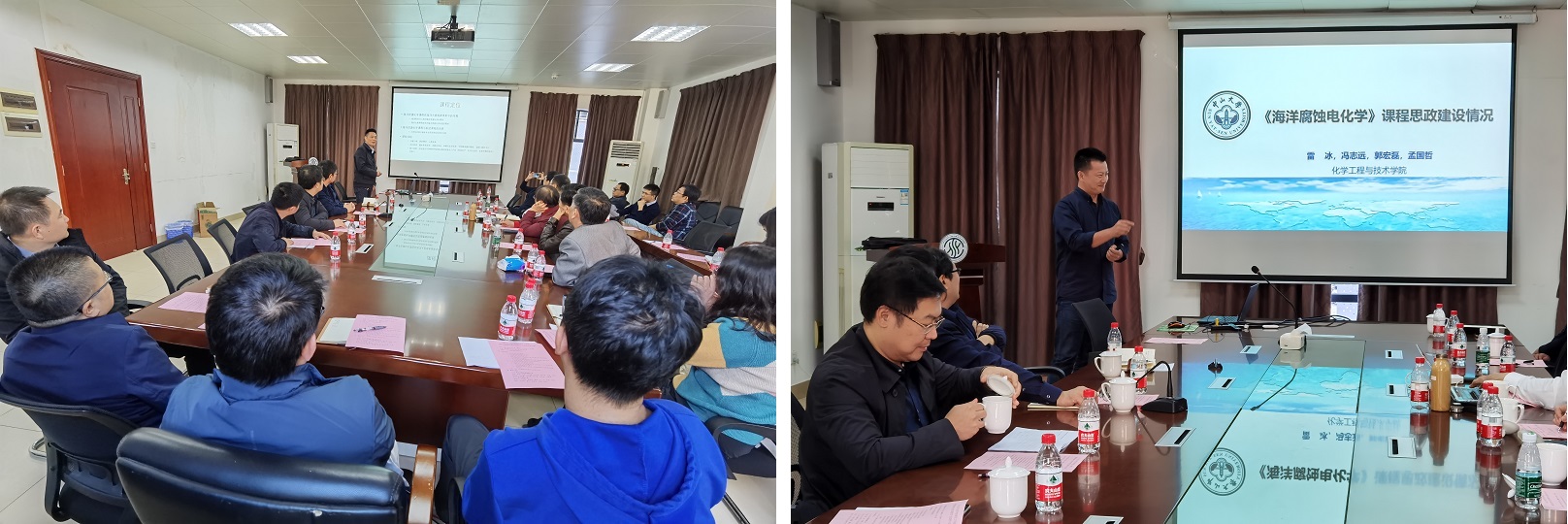 学院教研室主任万一千教授围绕《海洋资源化学》课程介绍了我院大类培养课程的建设思路和教学安排。万老师分别从课程定位、任课教师队伍的组建、课程大纲和内容的确定、课程实施方案和教学效果考察等多方面阐述了《海洋资源化学》大类培养课程的初步探索。万老师指出大类培养课程面向大一新生,具有学生数量多、学习积极性高、专业兴趣广、平行班多等特点,如何做好《海洋资源化学》课程规划和实施方案至关重要,也可为今后其它大类培养课程积累经验。化工学院雷冰副教授以《腐蚀电化学》课程为例,分享了他在课程思政建设方面的教学经验。雷老师从国家产业需求导向、学科发展前沿、学科发展历史人文、引导式教学等四个方面入手,重新组织安排传统腐蚀电化学的课程内容,自然生动地将专业知识与国家战略需求、工匠精神、家国情怀、学习兴趣等思政元素相结合,极大地激发了学生的学习积极性,并收获了学生的青睐。