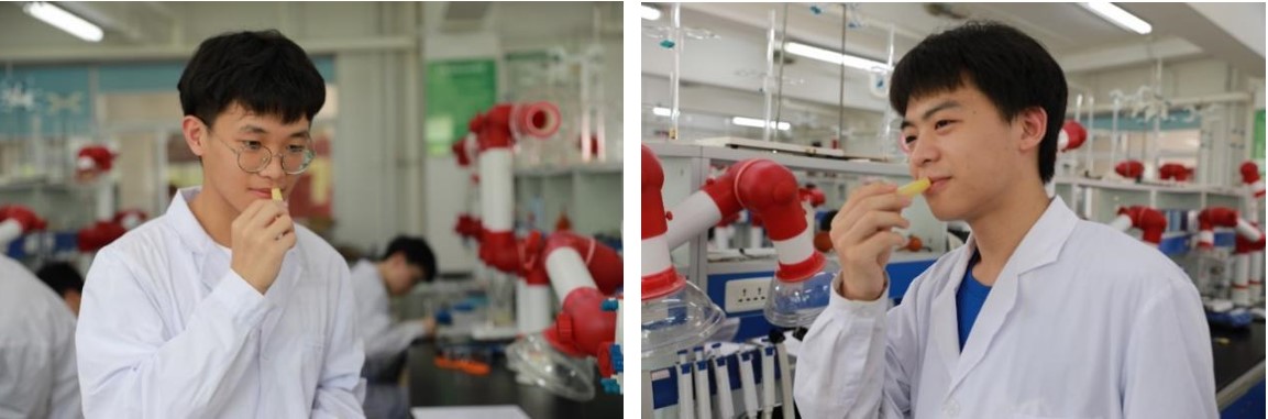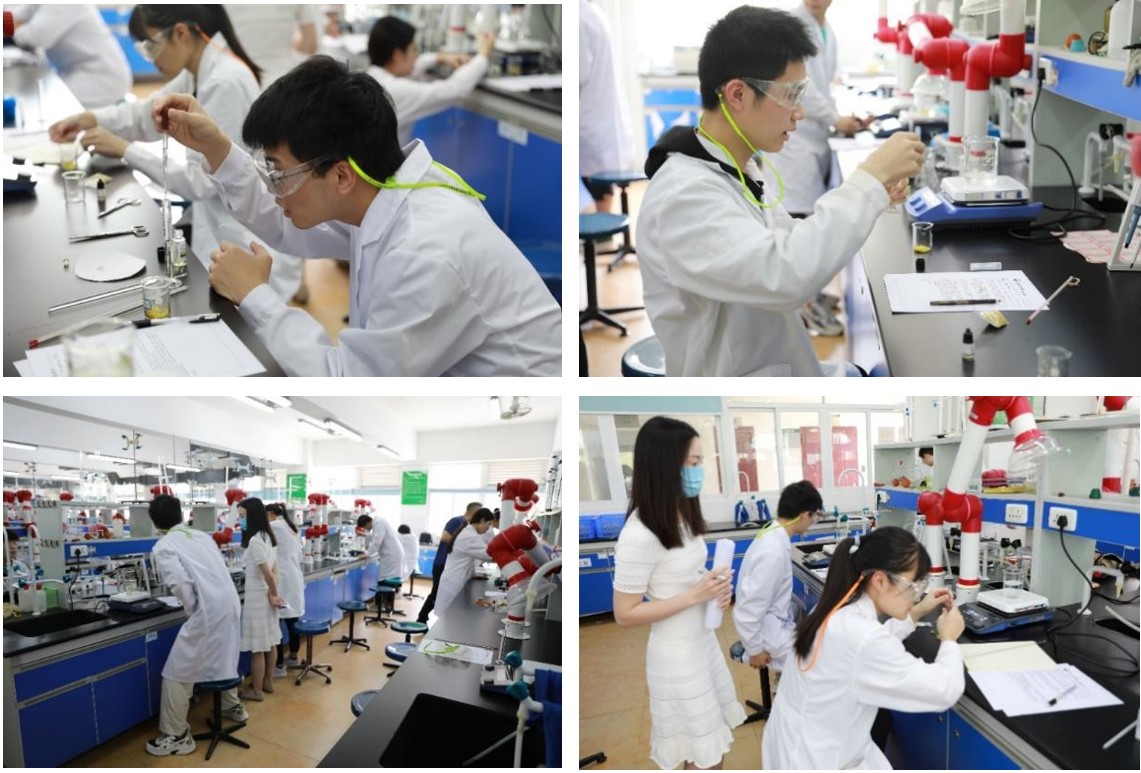 在做好充分的赛前准备后,同学们有条不紊地开始了唇膏的制作。在老师的指导下,同学们利用提供的植物油、土蜂蜡、精油等原材料,仔细量取、严格配比、严谨操作,整个实验室散发着唇膏的香气。经过近1小时的实验过程,各组同学陆续完成操作,等待冷凝、检验成果。