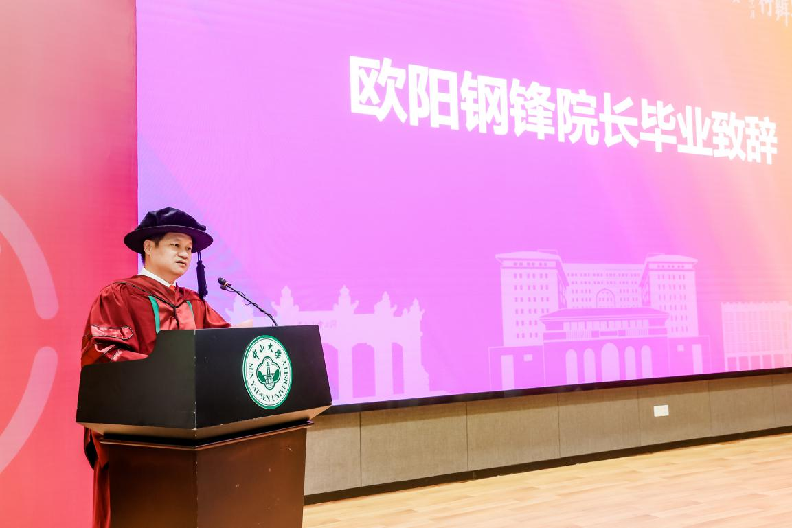学位授予后,欧阳钢锋院长致辞。他首先代表学院祝贺全院163名学生通过自己的努力圆满完成了学业,获得了宝贵的学位,开启了人生的新征程。欧阳院长表示,毕业生们在校期间克服了新冠肺炎疫情对教学、科研、生活的影响,顺利完成了学业,应当为取得的成就感到自豪;未来将面对人生道路上的各种困难和挑战,需要有面对困难和挑战的勇气。勉励毕业生们珍惜伟大的时代,勇于创新,勇做走在时代前列的奋进者、开拓者、贡献者。