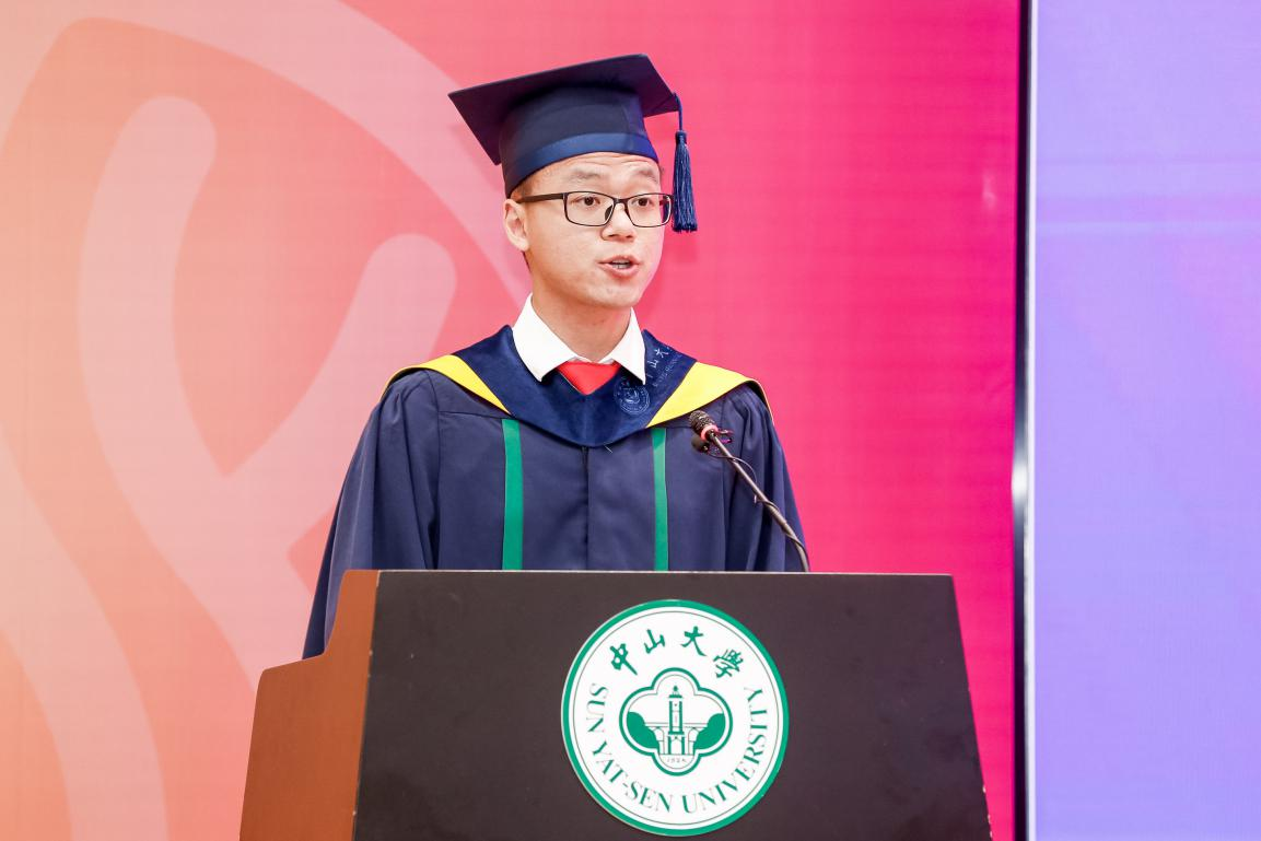 优秀硕士毕业生吴绍霖同学代表研究生发言。他通过讲述自己对科研的执着和坚守,带来学业的收获和内心的宁静,告诉同学们要坚持不懈的奋斗,为国为民,有一分热,便发一分光。