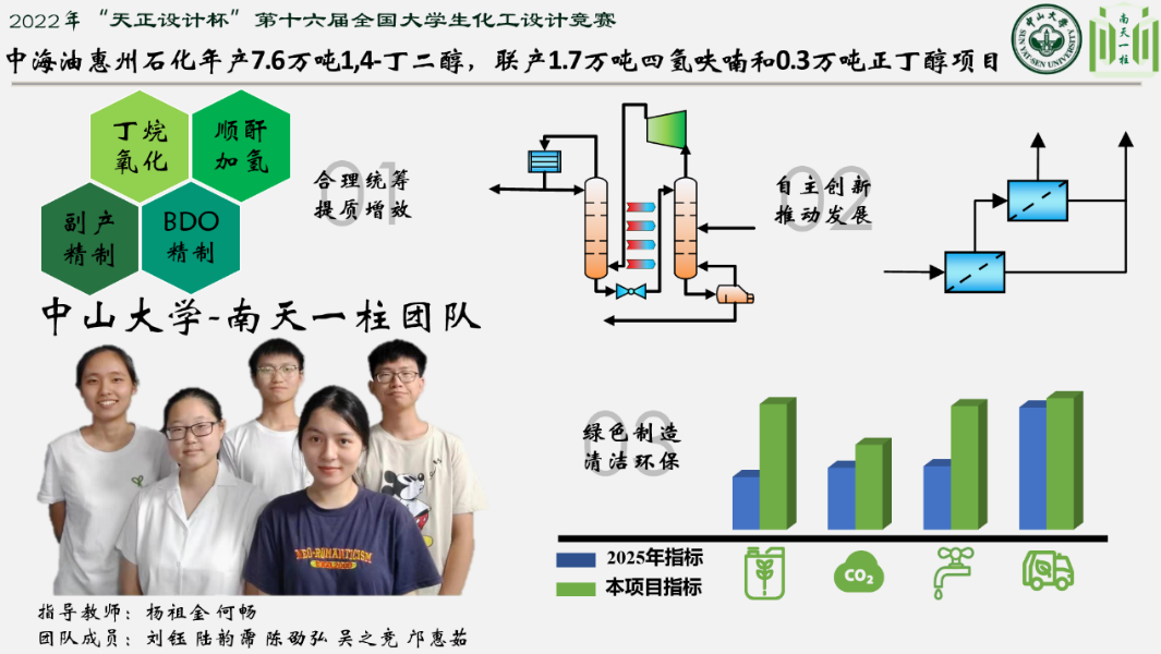 本届大赛设计题目为“为某大型化工企业设计一座1,4-丁二醇生产分厂或为现有的1,4-丁二醇生产分厂设计技术改造方案”,并要求技术符合中国绿色低碳发展要求。我校“南天一柱”团队以“中海油惠州石化分公司年产7.6万吨1,4-丁二醇,联产1.7万吨四氢呋喃和0.3万吨正丁醇项目”为题,凭借扎实的专业基础,过硬的专业能力和良好的团结协作精神,经十个月的精心准备,完成了目标产品的生产工艺路线调查并进行比选与比对,再进行工艺流程设计并进行可行性论证,设计过程中通过换热网络的优化对厂区实现高效节能,绘制了物料工艺流程图和管道仪表流程图,配套做好了化工设备机械设计与选型、及关键设备的图纸绘制,合理布局了车间和厂区,完成了环境影响、安全生产、经济效益等多方面的评估,最后利用三维建模和渲染制作厂区的漫游视频等有关工作,为1,4-丁二醇绿色低碳发展提供一种新的思路和解决方案。