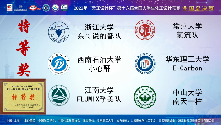 8月21日至22日,由中国化工学会、中国化工教育协会、教育部高等学校化工类专业教学指导委员会主办,华东理工大学承办的2022年“天正设计杯”第十六届全国大学生化工设计竞赛全国总决赛通过线上方式举行。来自浙江大学、中山大学、天津大学、华东理工大学等60支优秀代表队伍参加了本次决赛。经过两天的激烈角逐,我院由刘钰、陆韵霈、陈劭弘、邝惠茹、吴之竞等5位本科生组成的“南天一柱”代表队,在杨祖金、何畅副教授的指导下,以优秀的设计和精彩的现场答辩得到专家评委的好评,荣获总决赛特等奖。
