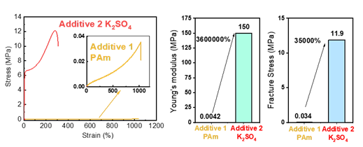 通过细致的实验探究和机理分析,作者证实添加剂通过影响凝胶中的非共价相互作用,改变凝胶中刚性疏水区和柔性亲水区域的强度,从而改变凝胶的玻璃化转变温度,进而在不改变温度的情况下,智能调节凝胶的力学行为。同时,作者发现不同类型的小分子对凝胶机械性能的影响迥异。其中,无机添加剂多通过Hofmeister效应来调节凝胶亲水结构的含水量;而有机添加剂同时影响亲水和疏水区域的强度,从而调节水凝胶的机械行为。基于此,作者开发了一种在几乎不影响凝胶平衡体积的前提下,大幅调节凝胶机械行为的方式。其杨氏模量跨越从kPa到接近GPa的范围,较之此前报道的凝胶优势明显(图4)。因此,材料在柔性传感、工业涂层等领域均展现出良好的应用前景。