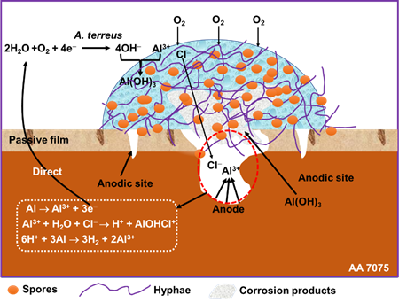 进一步以7075 AA-1作为典型实验样品,研究了铝合金真菌腐蚀机制。在A. Terreus存在条件下,可以观察到大量的菌丝和袍子的存在,说明在微液滴下真菌A. Terreus可以良好生长和繁殖,而且液滴体积的增加可以提高A. Terreus的活性,从而为加速铝合金腐蚀奠定了基础。在上述研究结果的基础上,提出了微液滴环境下真菌A. Terreus加速铝合金点蚀机制示意图,如图3所示。真菌A. Terreus在铝合金表面的生长和繁殖导致铝合金表面钝化膜局部破裂,从而引发点蚀,真菌的存在通过氧浓差电池效应显著的加速了点蚀的生长。