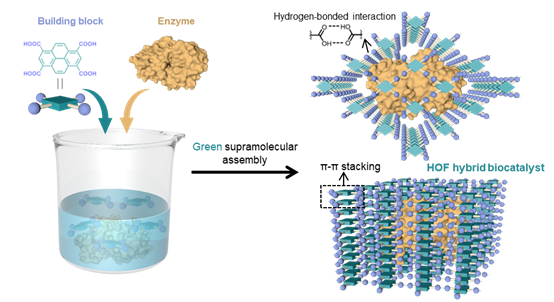 天然酶是一类具有催化活性的天然聚合物,通过绿色、温和、高效的方式催化细胞内的生物化学反应,具有人工催化剂无法比拟的高效率。然而,酶的柔性构象在外界刺激下极易发生变化,极大地限制了酶的大规模工业应用。利用多孔超分子“盔甲”对天然酶结构进行约束、保护是设计多功能杂化生物催化剂的有效手段,既能解决酶的稳定性问题,又能提高酶的可重复性。尽管该领域已取得了系列进展,但多孔超分子框架的结晶往往需要苛刻的条件,如何实现在生物相容条件下原位装配超分子晶体“盔甲”仍是技术难点。