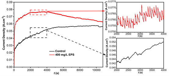图1 模拟海水介质中恒电位极化阳极电流密度在有无EPS存在条件下随时间的变化图