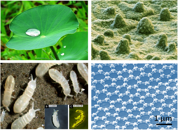 图1 自然界中的自清洁表面:荷叶“出淤泥而不染”(上)和弹尾虫的超疏液结构(下)