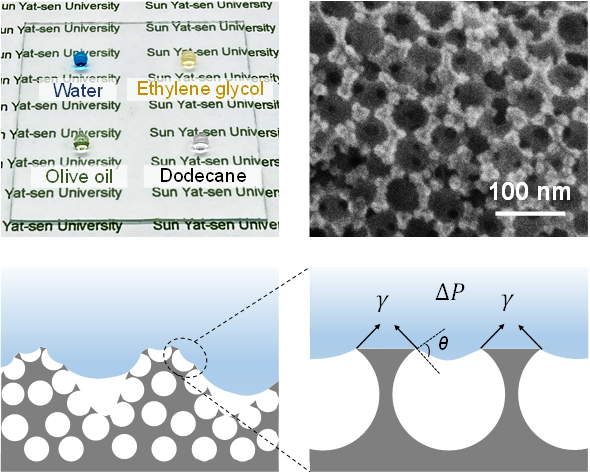 目前,该成果以标题“Transparent superamphiphobic material formed by hierarchical nano-reentrant structure”发表在国际著名期刊《Advanced Functional Materials》(IF=19.9)上。本文第一作者是中山大学硕士研究生李豪俊和金青青,通讯作者是中山大学李亚楠副教授,欧阳钢锋教授和香港理工大学的王钻开教授。该研究受到国家自然科学基金、中山大学百人计划启动经费、中央高校基本科研业务费专项资金等资助。