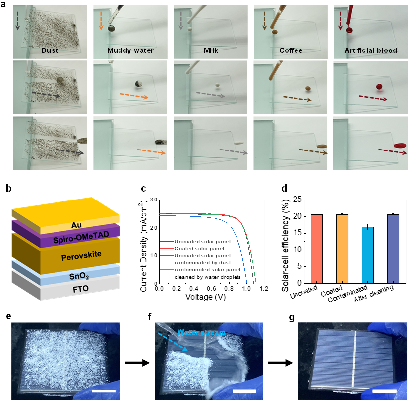 图3 透明超双疏表面的自清洁性能展示及其在钙钛矿和商用硅基太阳能电池面板上的应用