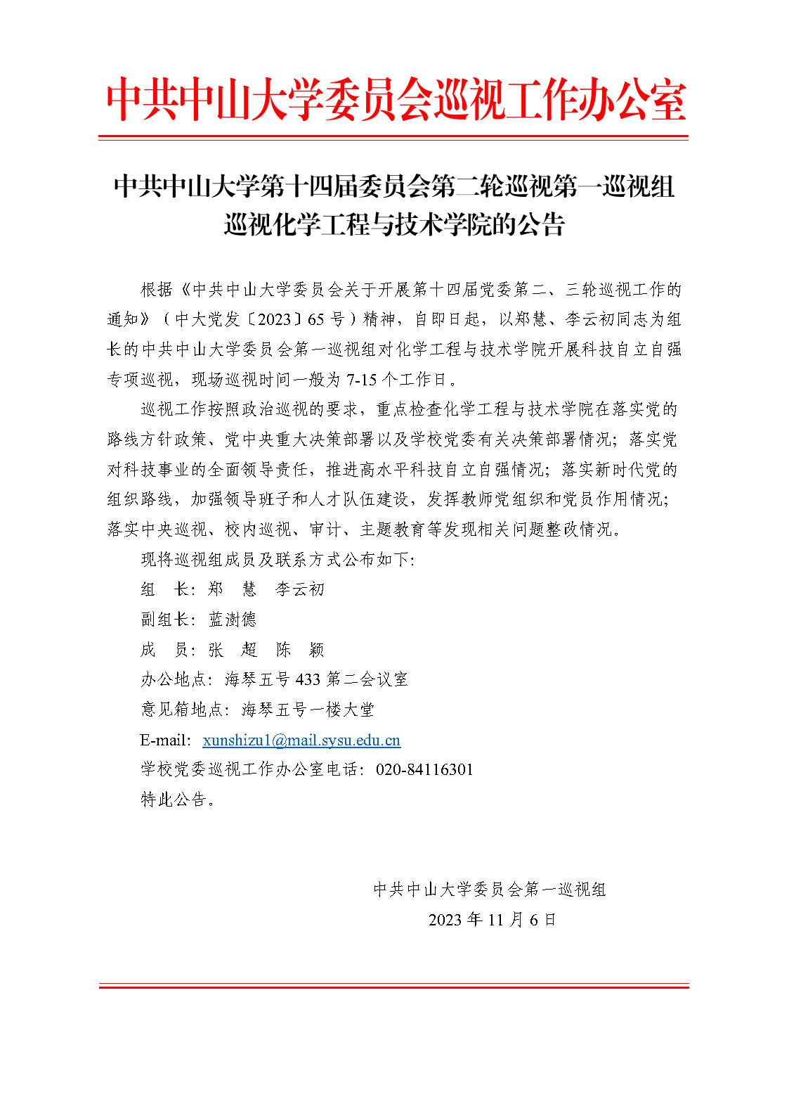 中共中山大学第十四届委员会第二轮巡视第一巡视组巡视太阳网集团tcy8722的公告