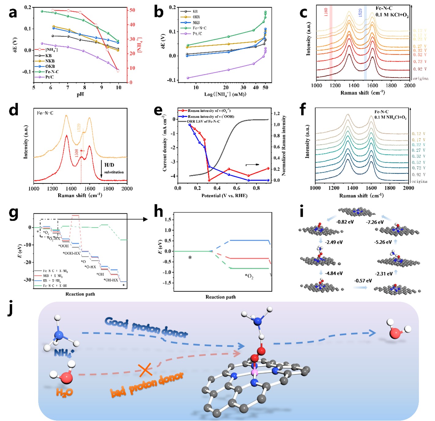 研究发现,NH₄⁺在中性电解液中可替代 H₂O 作为质子供体,显著降低 ORR 中间体质子化能垒(如*O₂⁻→*OOH 的能垒从 1.55 eV 降至 0.82 eV)。通过原位拉曼光谱与密度泛函理论(DFT)计算,证实 NH₄⁺通过 N-H 键解离提供质子,加速四电子 ORR 路径,使 Fe-N-C 催化剂的半波电位(E₁/₂)提升 151 mV,动力学电流密度(Jₖ)提高 48 倍(图1)。