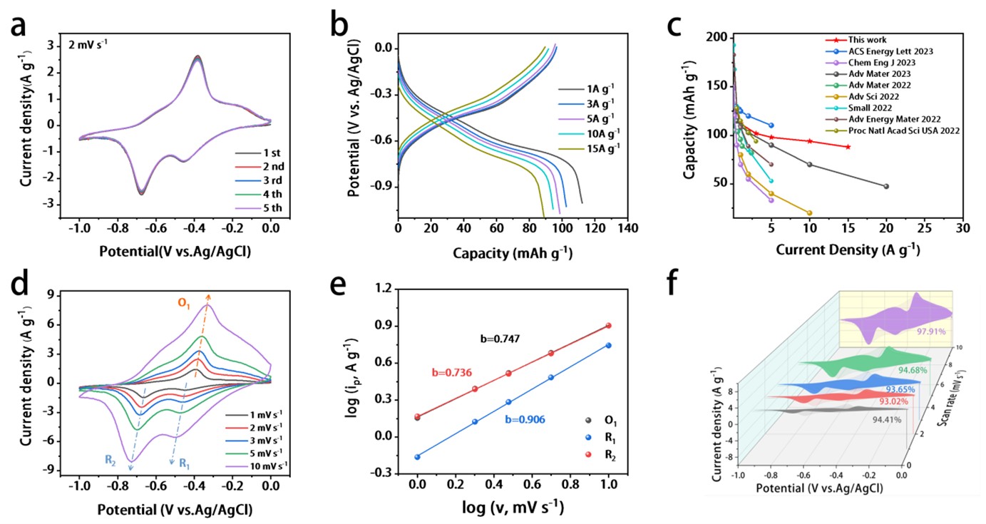 开发的聚萘四甲酸二酐 - 对苯二胺(PNP)有机阳极,通过 “千层石” 结构实现快速 NH₄⁺传输。PNP 展现超高比容量(112 mAh g⁻¹ at 1 A g⁻¹)与倍率性能(89 mAh g⁻¹ at 15 A g⁻¹),伪电容贡献占比达 94%,确保高功率输出(图2)。
