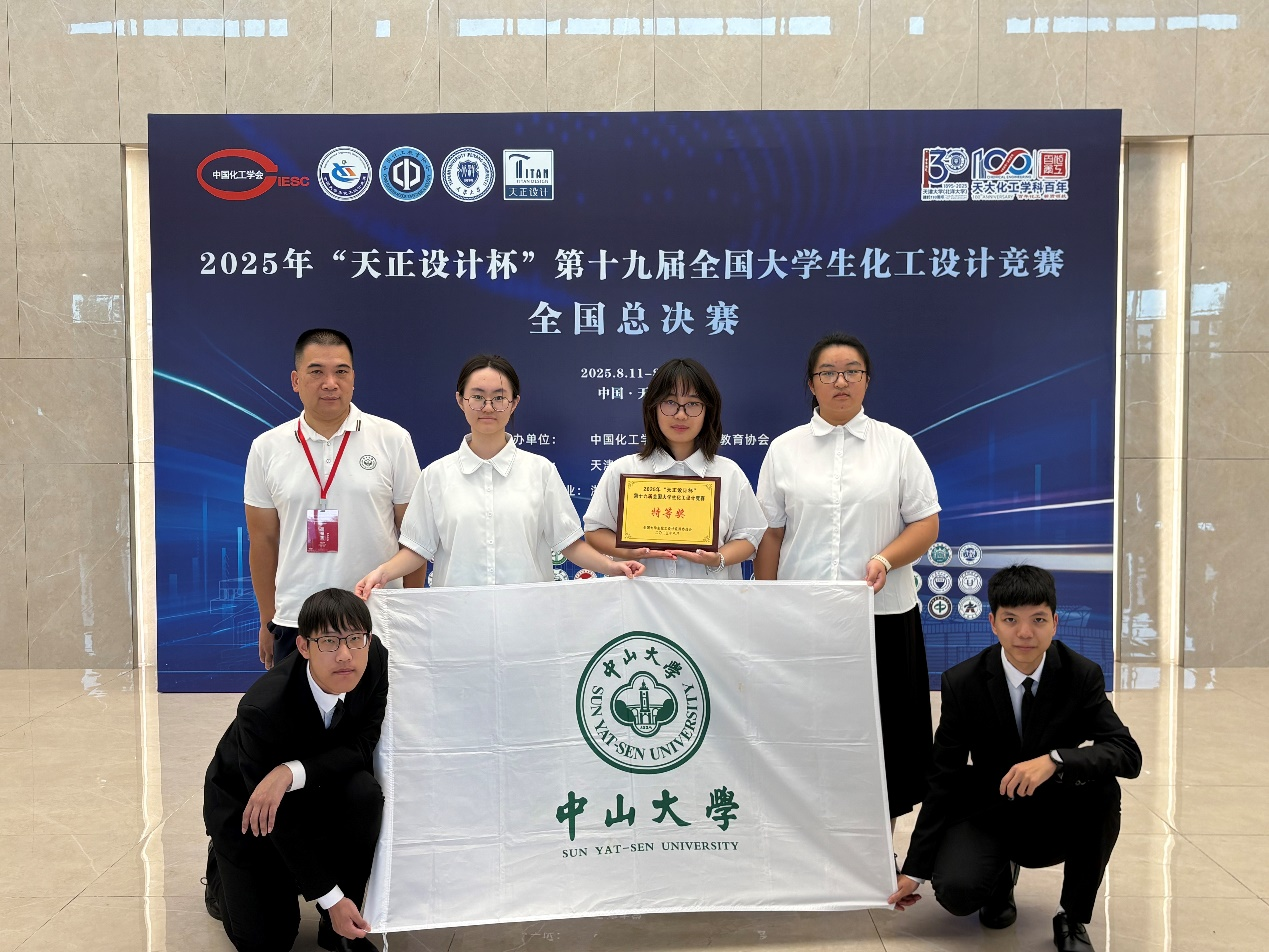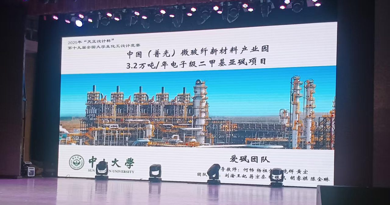 2025年8月11日至17日,第十九届全国大学生化工设计竞赛全国总决赛(全国性A类赛事)在天津大学举行。太阳网集团tcy8722“爱砜”团队(队员:刘渝王妃、蒋京秦、陈金琳、柳姝帆、胡睿祺)在何畅副教授、杨祖金教授、何晓辉教授和黄宏博士的指导下从全国456所高校的2571支团队中脱颖而出,荣获全国总决赛特等奖、华南赛区决赛特等奖和广东省决赛特等奖。