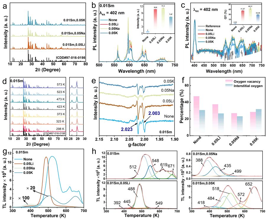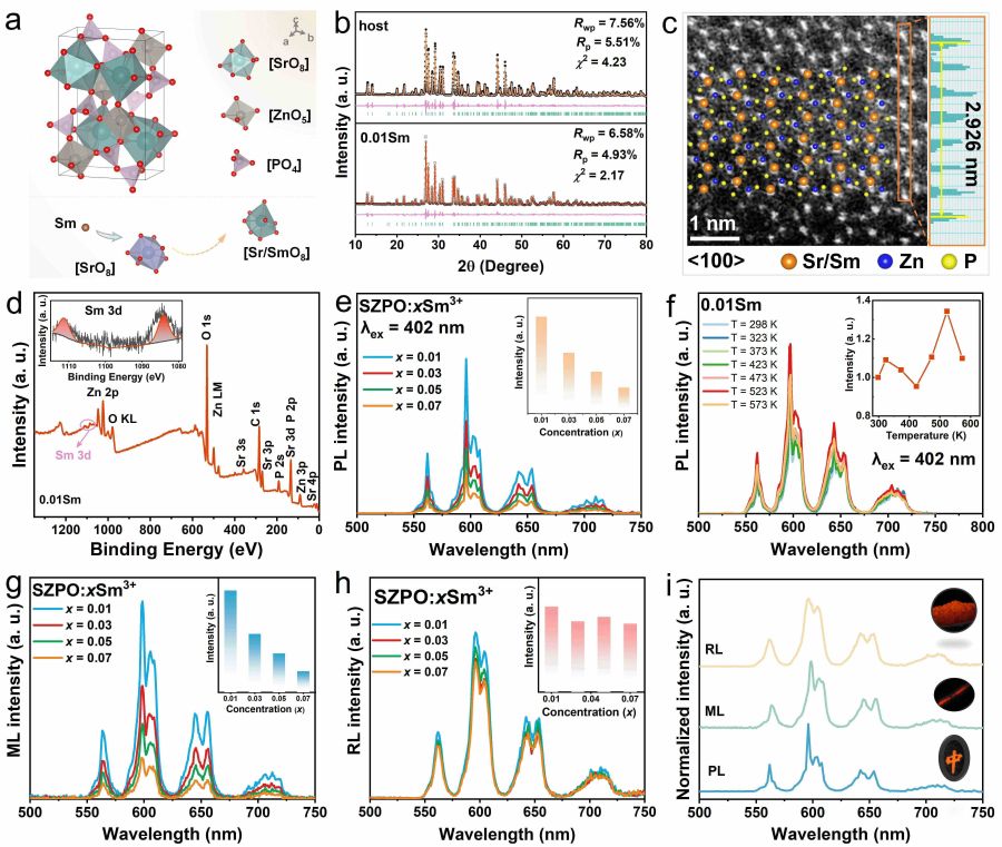 近日,我院吴明娒教授研究团队开发了一类新的SrZnP2O7:RE (RE = Sm3+, Dy3+, Tb3+, Tm3+)多模发光材料,通过缺陷工程策略有效地解决上述挑战。该类荧光粉表现出光致发光(PL)、辐射发光(RL)、力致发光(ML)、热释光(TL)和长余辉发光(PersL)等多种发光行为,发射波长覆盖近紫外至远红外区域。研究团队通过策略性地引入电荷补偿剂(Li+,Na+,K+),精确地调节了陷阱密度和分布,显著的提升了PL强度、量子效率、RL强度以及X射线余辉性能。特别值得关注的是,在Sm/Dy/Tm掺杂体系中,材料呈现出独特的反热猝灭行为(即使在300℃下依然能超过室温下的发光强度),赋予了该材料在宽的温度范围内保持优异发光性能。凭借其优异的多模态发光特性,该类荧光粉在高温X射线成像、高安全性防伪与信息加密等领域展现出广阔的应用前景。
