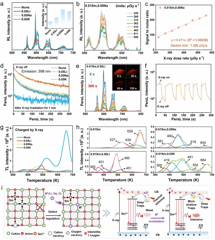 图3. 电荷补偿剂对SrZnP2O7:Sm的 RL 和PersL性能的影响及缺陷调控机制