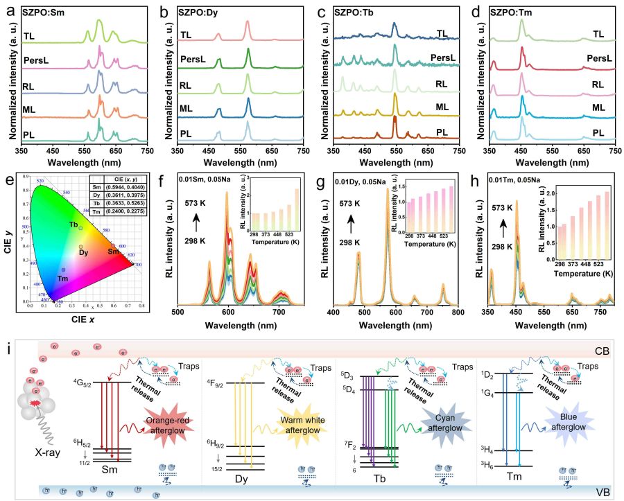 图4. SrZnP2O7:RE (RE = Sm3+, Dy3+, Tb3+, Tm3+)的多模发光及其反热猝灭发光特性