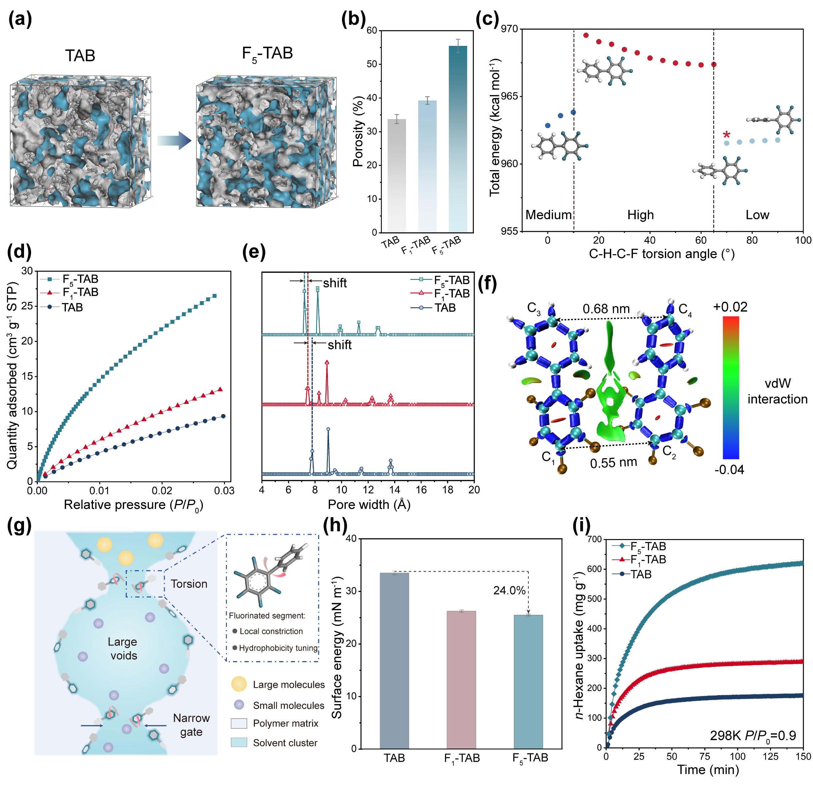 Fx-CMP膜的微环境工程通过引入单官能度含氟乙酰基单体实现。该单体具有与多官能度单体相似的反应活性,可在聚合过程中接入体系并引发链终止,从而在聚合物网络中引入可控缺陷。基于聚合物链的动态重组,末端的氟取代基可相互靠近,诱导形成大量互连通道。为最小化苯环与氟取代苯环之间的空间位阻和静电排斥,该结构单元采取高扭转角的刚性非平面构型,这一构型是氟化基团能够有效抑制链内紧密堆积、显著增加自由体积的结构基础。值得注意的是,链末端氟取代基间展现出增强的范德华力,引起链段的局部收缩,从而形成一种独特的异质孔结构:宽大的空腔仅能通过狭窄的孔颈连接,构成“笼型”传输通道。此外,氟取代基的引入降低了膜表面能,增强了与非极性溶剂之间的亲和力。综上所述,通过结合低表面能的大空腔与局部收缩的狭窄孔颈,Fx-CMP膜结构同时实现了溶剂的快速传输与溶质的选择性分子筛分。