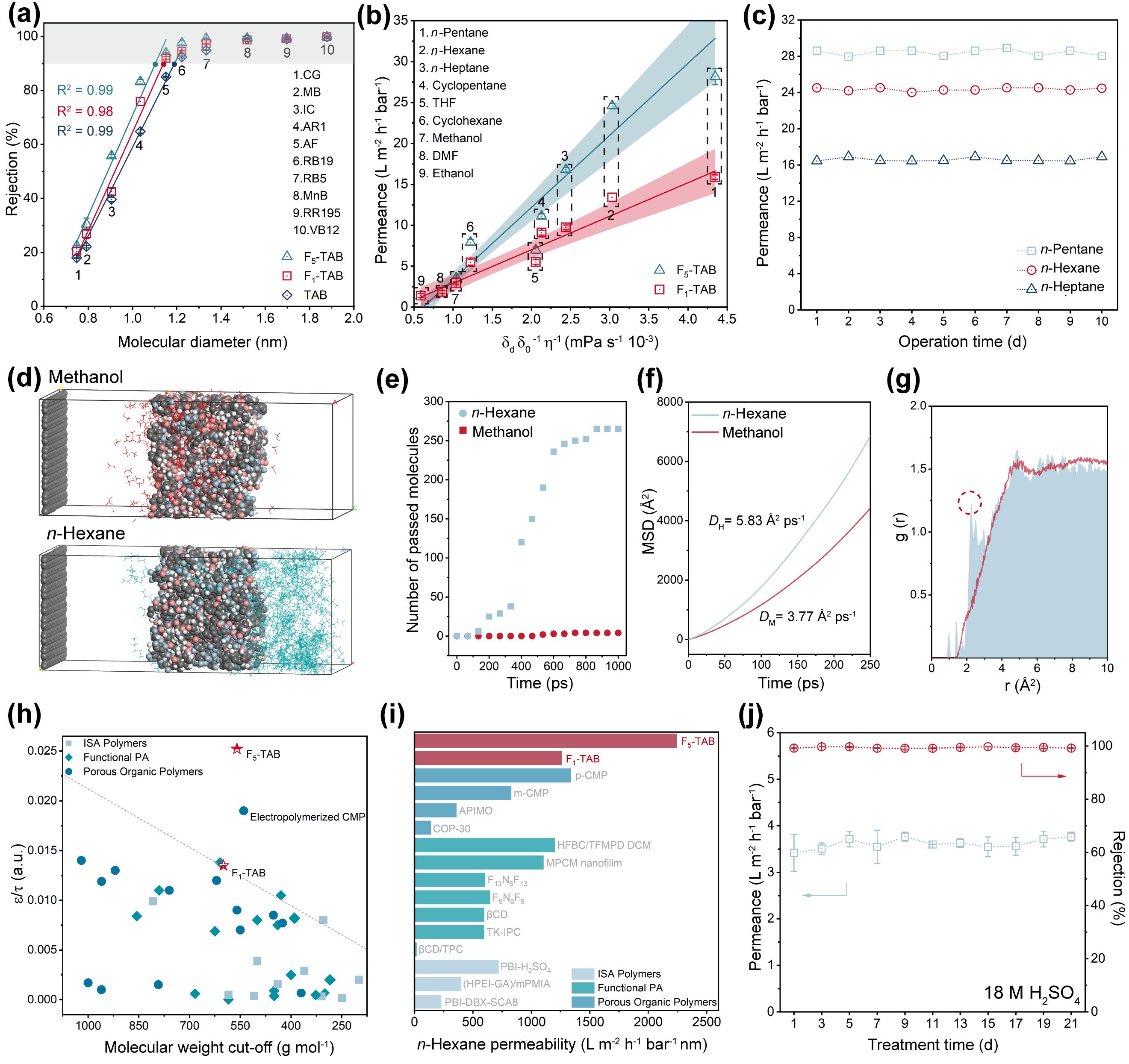 Fx-CMP膜具有迄今报道的聚合物膜中最高的结构参数ε/τ值(0.025),以及创纪录的正己烷渗透率2272 L·m⁻²·h⁻¹·bar⁻¹·nm,充分体现了其在孔道结构与化学环境协同设计方面的显著优势。由于C-F键的化学惰性以及氟原子对芳香环亲电性的削弱作用,Fx-CMP膜在18 M H2SO4溶液中浸泡几十天后仍能保持良好的选择分离性能,其耐酸性超越所有已报道的膜材料。这种卓越的化学稳定性不仅拓展了CMP膜在极端环境下的工业应用前景,也为强腐蚀介质中实现快速溶剂回收、高选择性分子筛分提供了崭新的技术途径。