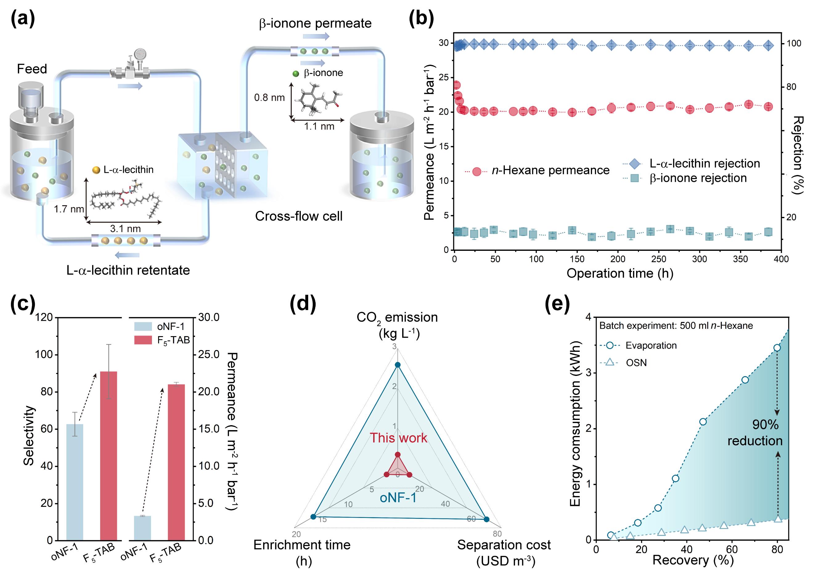 研究显示,Fx-CMP膜对多种高附加值活性药物成分均表现出超过99%的稳定截留率。其核心优势在于长期溶剂接触下无膜材料渗出现象,确保了制药工艺的安全稳定运行。针对市场需求广泛的L-α-卵磷脂与β-紫罗兰酮药物,进一步评估了大面积Fx-CMP膜的分离性能。值得一提的是,与商用BORSIG oNF-1膜相比,研究开发的Fx-CMP膜不仅将选择性提升了45%,同时正己烷渗透率提高约5.3倍,从而将分离成本降低约87%,并大幅减少了相应的碳排放。相较于传统蒸馏技术,基于Fx-CMP膜的分离工艺可降低90%的能耗。此外,该膜优异的机械稳定性允许通过提高操作压力进一步优化能耗表现。以上研究结果表明,Fx-CMP膜为高附加值药物分子的高效、低能耗分离提供了一条极具市场竞争力的技术新路径。