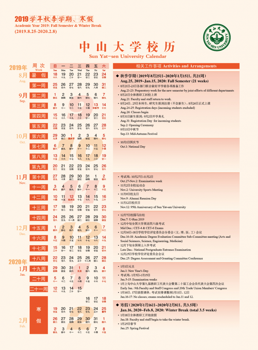 中山大学2019学年第1学期校历:                         附件3
