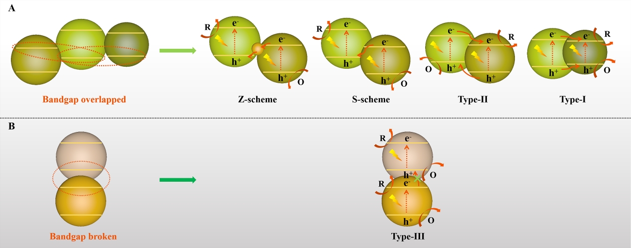 构建多组分或多相半导体异质结复合材料是提升光/光热/光电环境与能源催化中光利用效率的重要途径。然而,目前所报道的Type II型、Z型和S型等主流异质结材料都要求半导体之间的能隙存在交错,难于同时获得宽光响应范围和高氧化还原电位,限制了半导体异质结催化材料的选用范围和性能提升。另一大类能隙分裂类的III型异质结虽可同时获得宽光响应范围和高氧化还原电位,但由于组分间带隙不交错,难于形成有效的相间光致电荷传递与分离,也鲜有应用。图1总结了目前文献报道的主要半导体异质结材料。